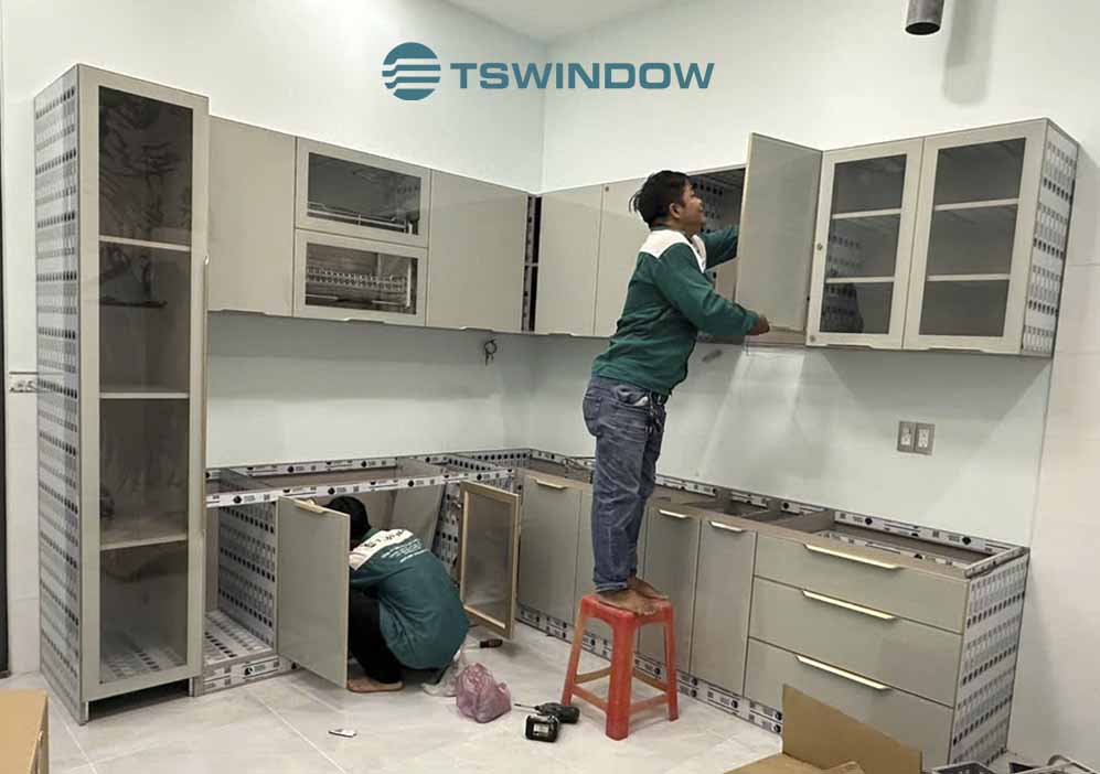 Hình ảnh thợ nhôm kính TSwindow đang lắp đặt tủ bếp cánh kính